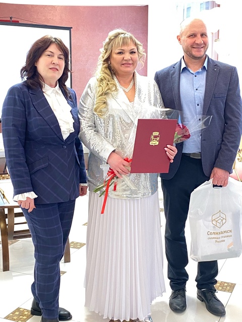 От имени главы администрации Соликамского муниципального округа Александра Русанова юбиляров поздравила Инна Тонких, заместитель главы округа, которая вручила супругам памятный адрес.