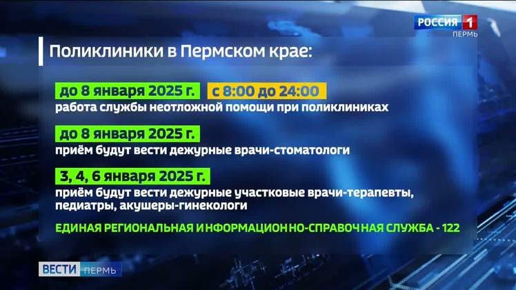Экстренные, коммунальные и городские службы напоминают график работы в праздничные дни. Так во всех поликлиниках края - 3,4 и 6 января прием будут вести дежурные терапевты и педиатры, а также акушеры-гинекологи.