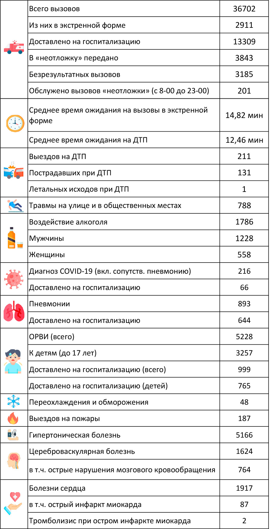 Всего было выполнено 36702 вызова. Из них в экстренной форме — 2911. Среднее время ожидания на вызовы в экстренной форме — 14,82 мин.
