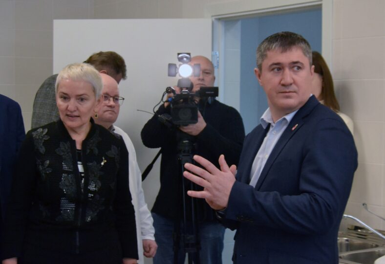 25 декабря 2023 года. Ленточку на торжественном открытии хирургии режут министр здравоохранения Анастасия Крутень и главврач БКПО Игорь Уточкин. Фото: Константин Седегов, “ПН”Ранее в статье «Кто и как такую работу принял?» по отзыву пациента мы писали, что в палатах недавно введённого в эксплуатацию здания идёт от окон холодный воздух, в санузлах не закрываются двери, есть путаница с выключателями света, и поскольку термоса для пищи старые, еду дают больным холодную.
